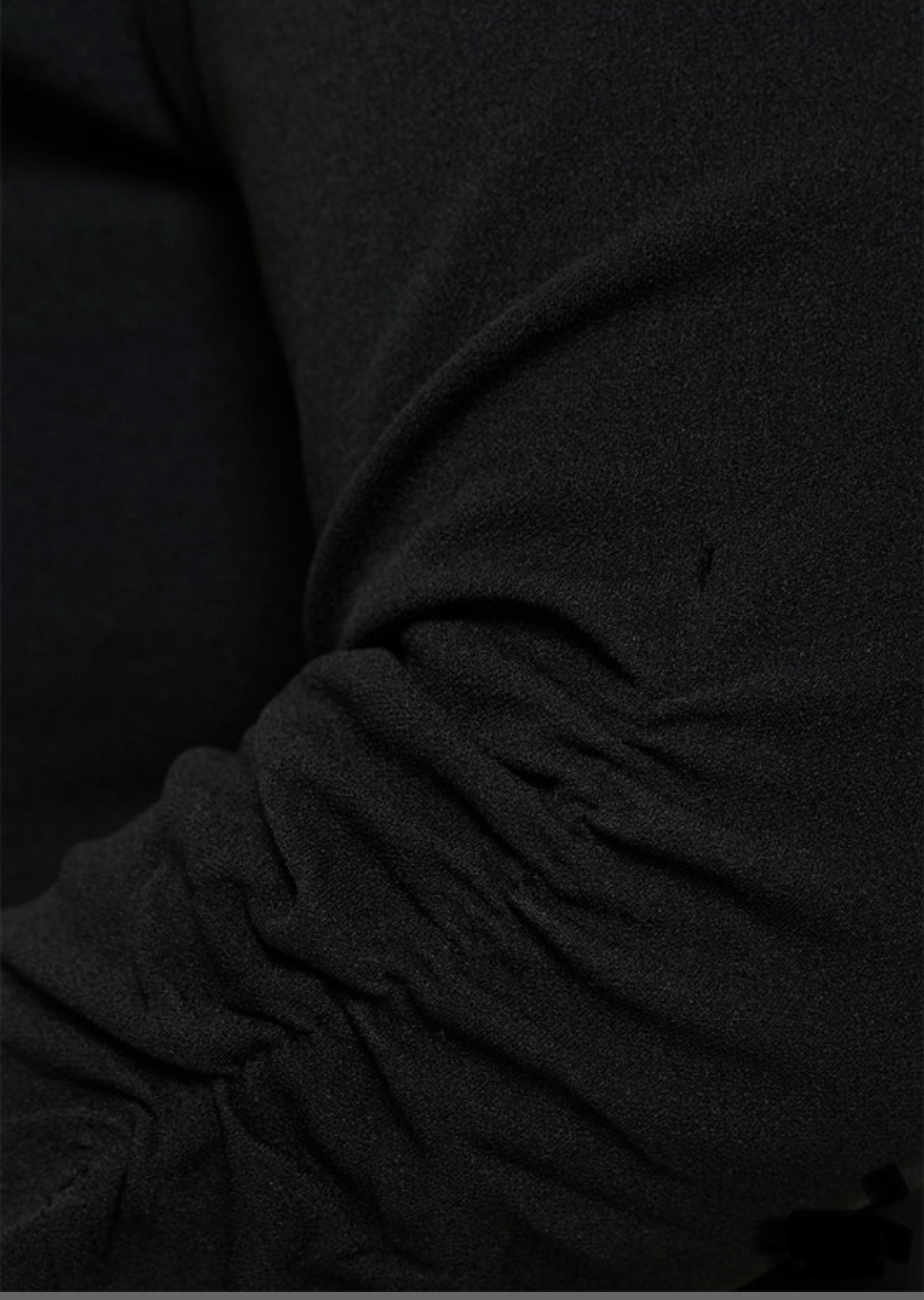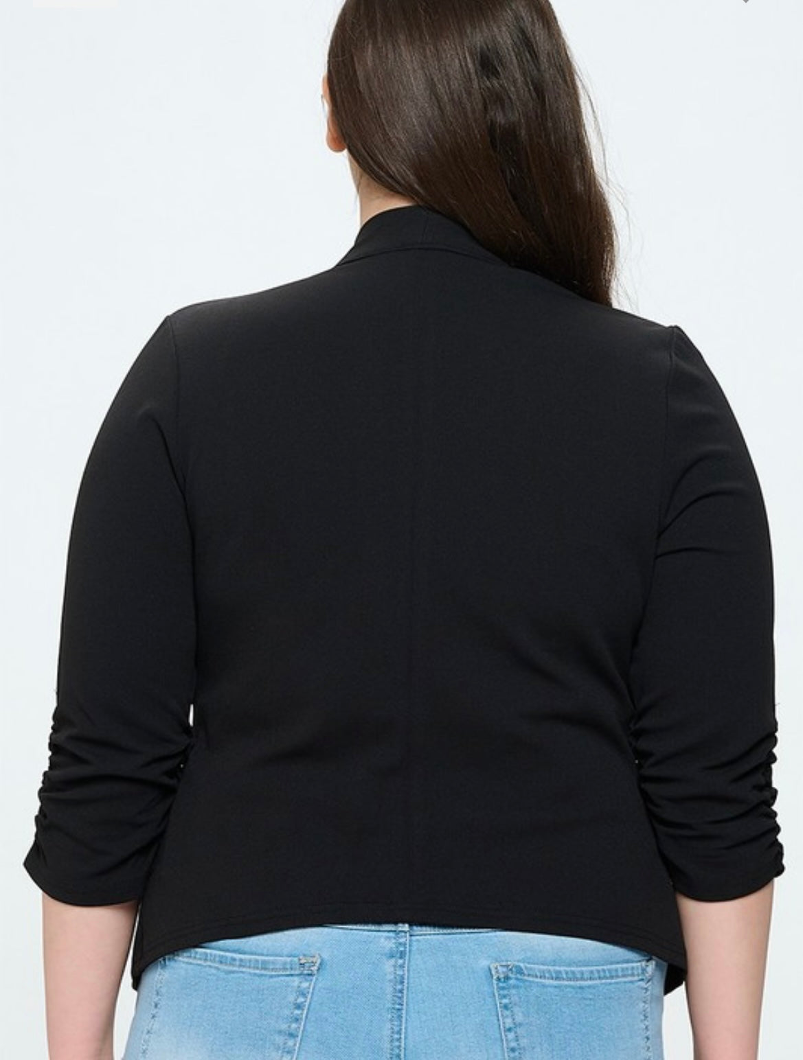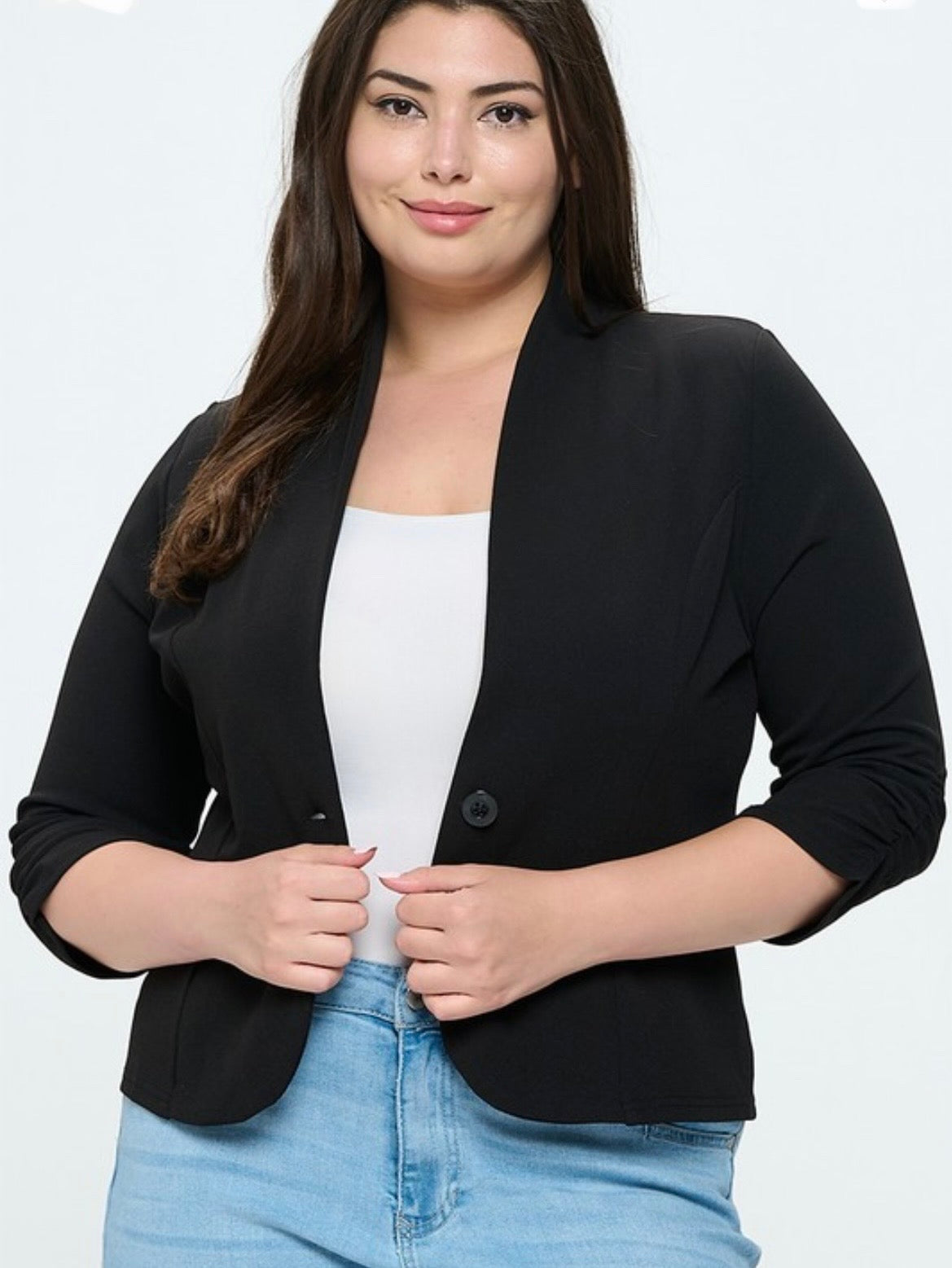 Fitted black waistline blazer with ruched 3/4 sleeves and single button closure in front. 90% Polyester 10% Spandex