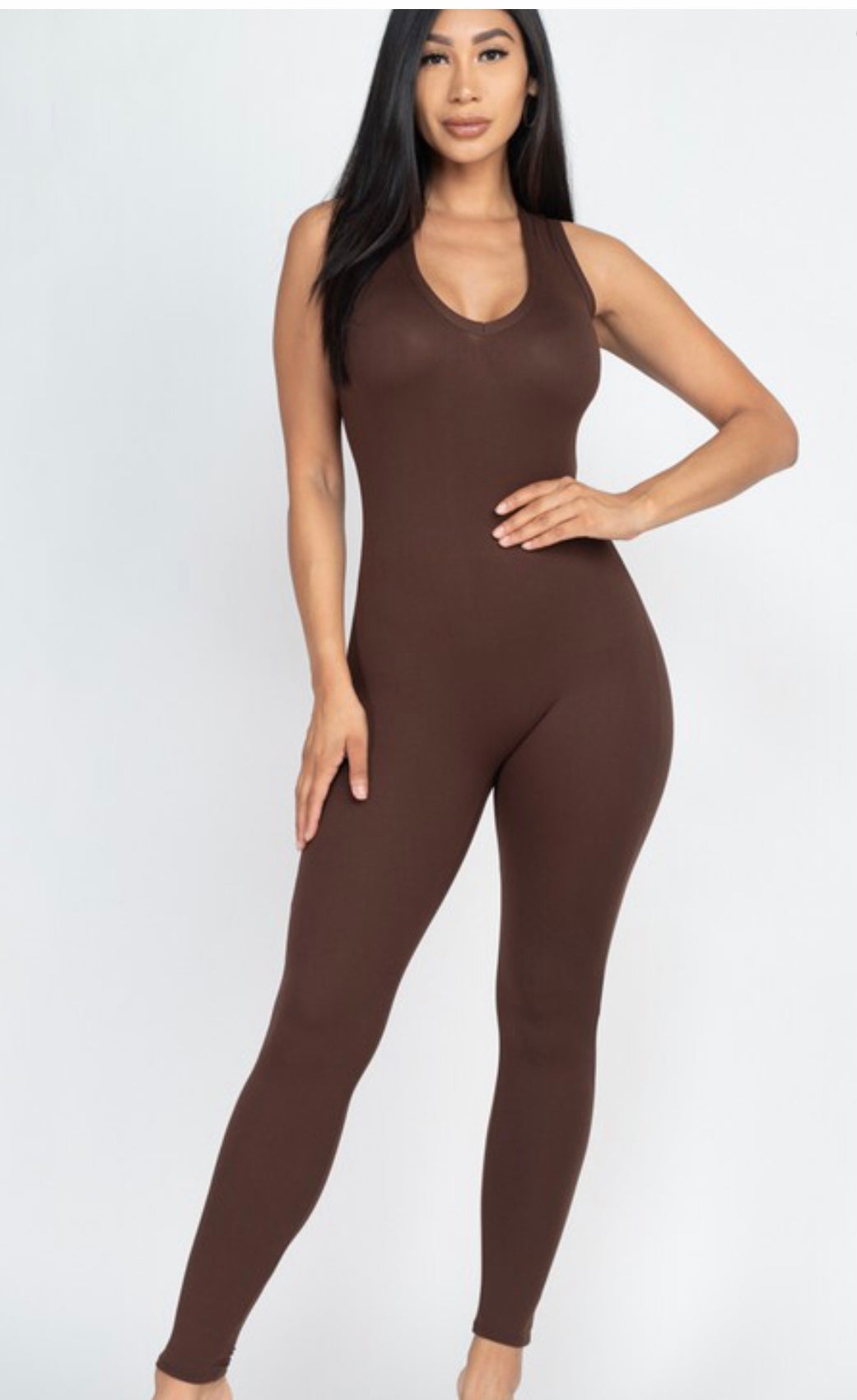 One piece stretch knit racer back body con catsuit. Available in taupe or chocolate brown.