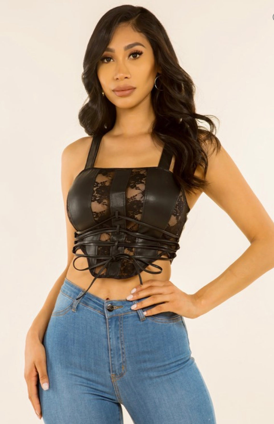 Lace cami top with faux leather, and adjustable shoulder straps.