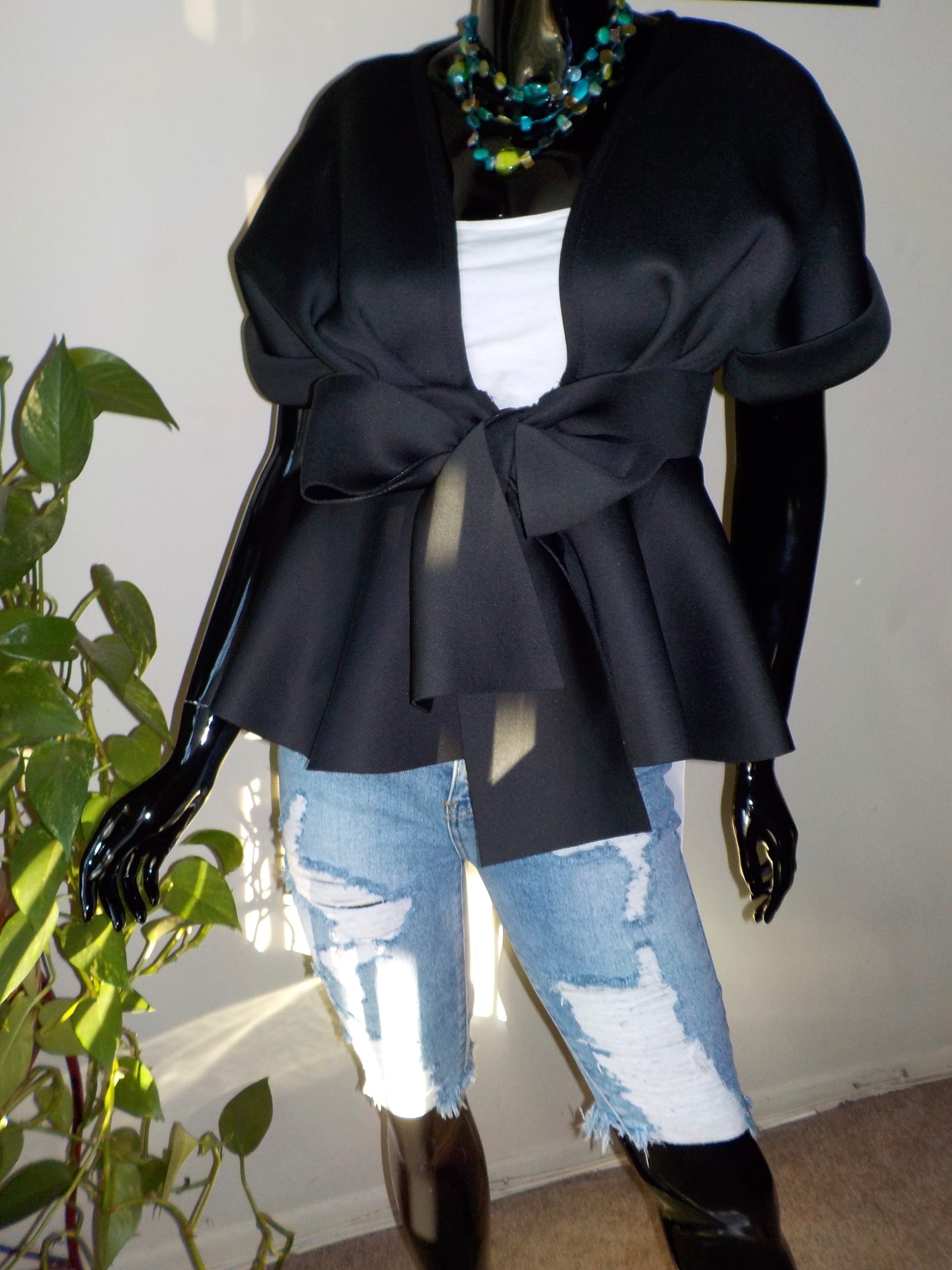 Short sleeve, Peplum jacket. Paired with our Myra distressed denim Bermuda shorts. *Jacket is scuba fabric.