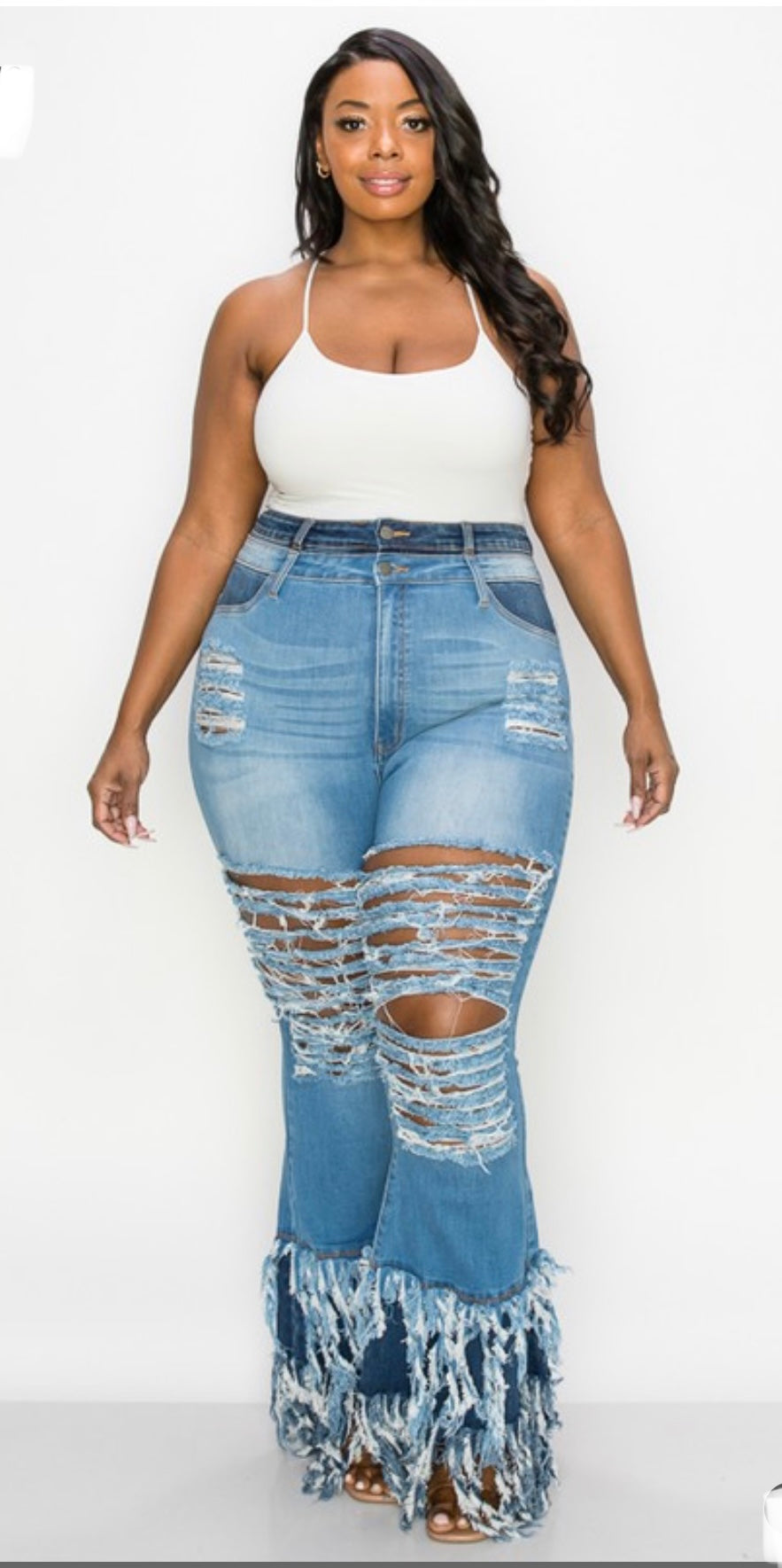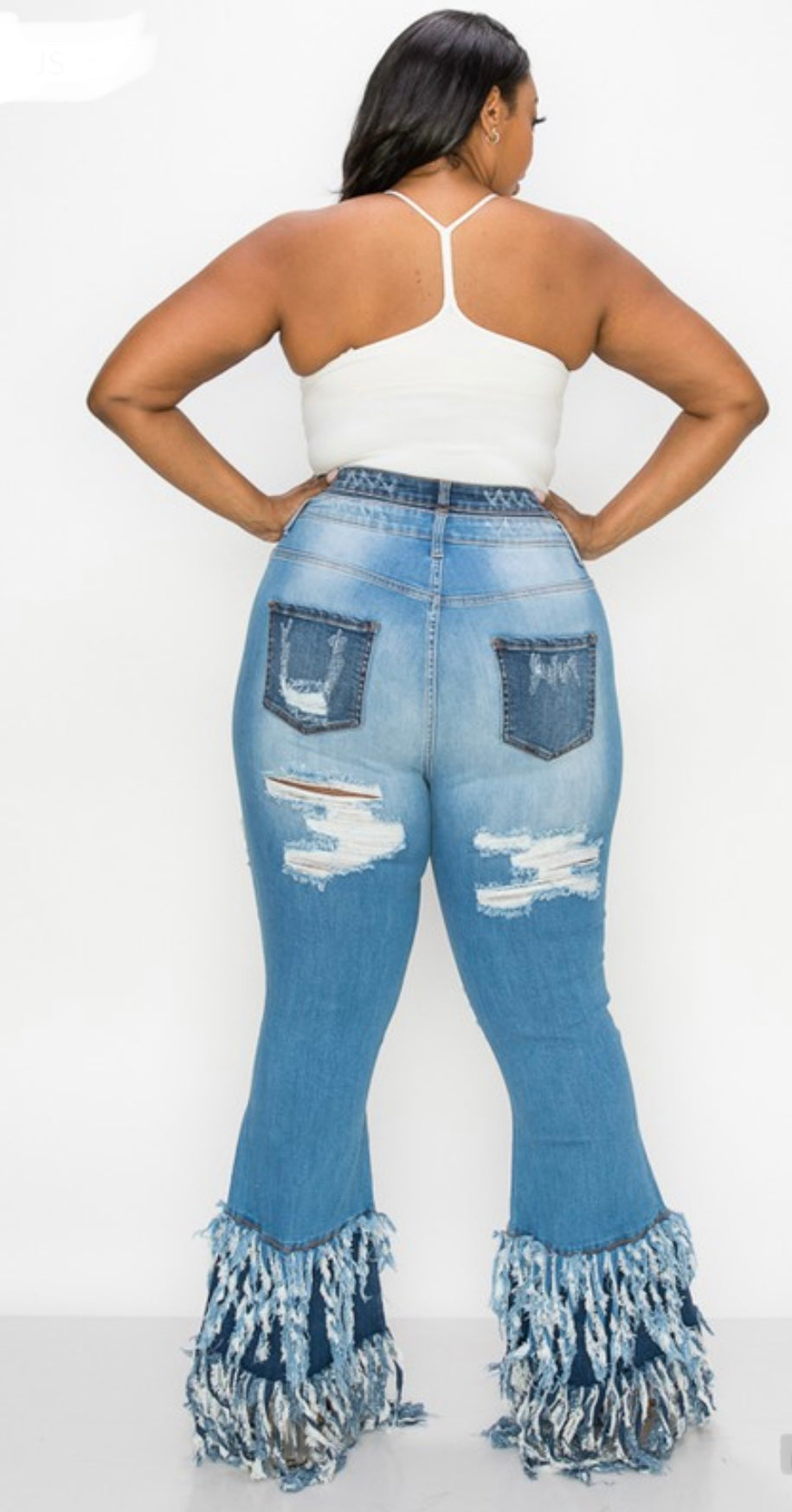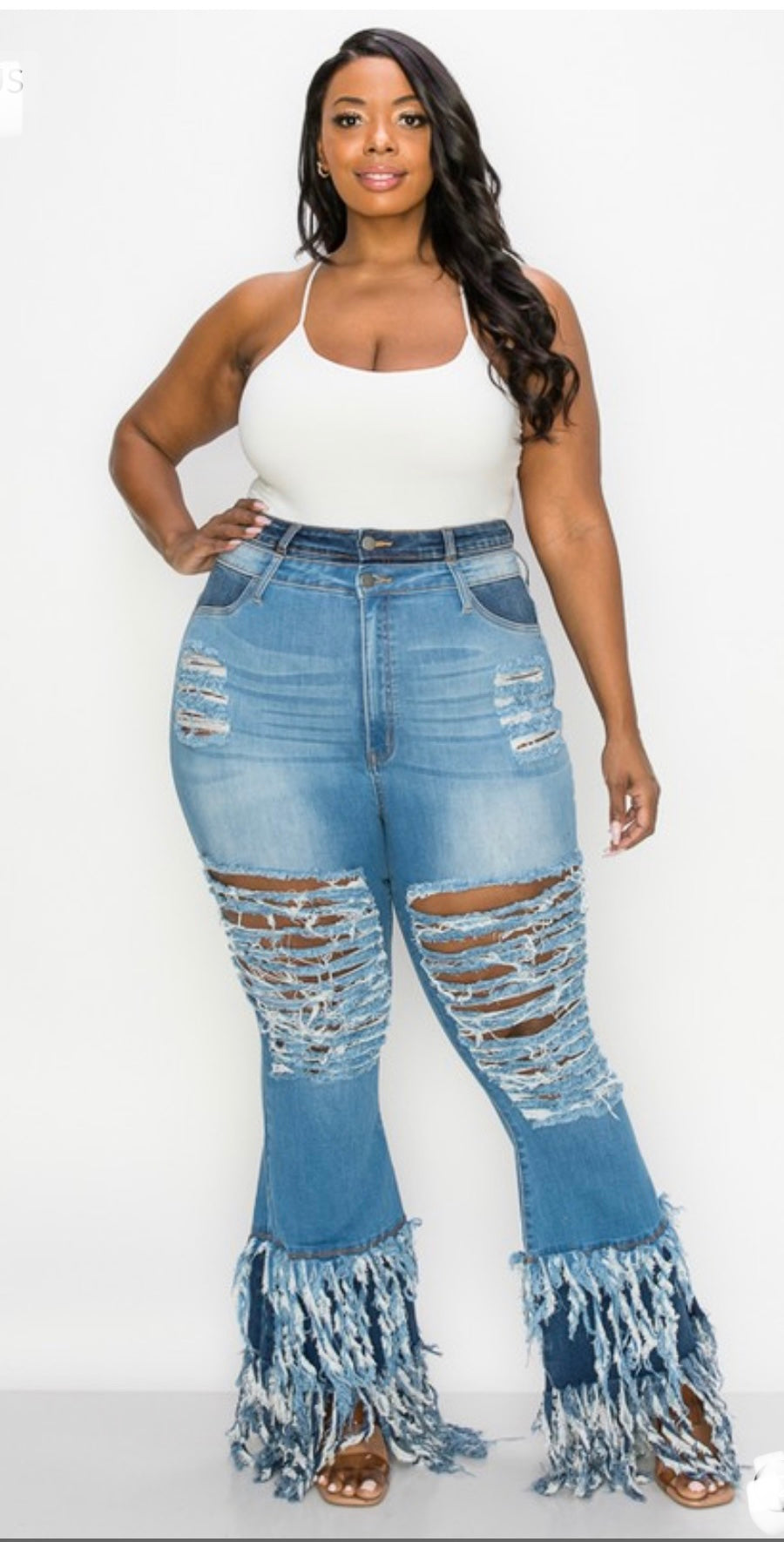 Two high rise destroyed jeans with tassels on the legs. Fits true to size with some stretch for added comfort.
