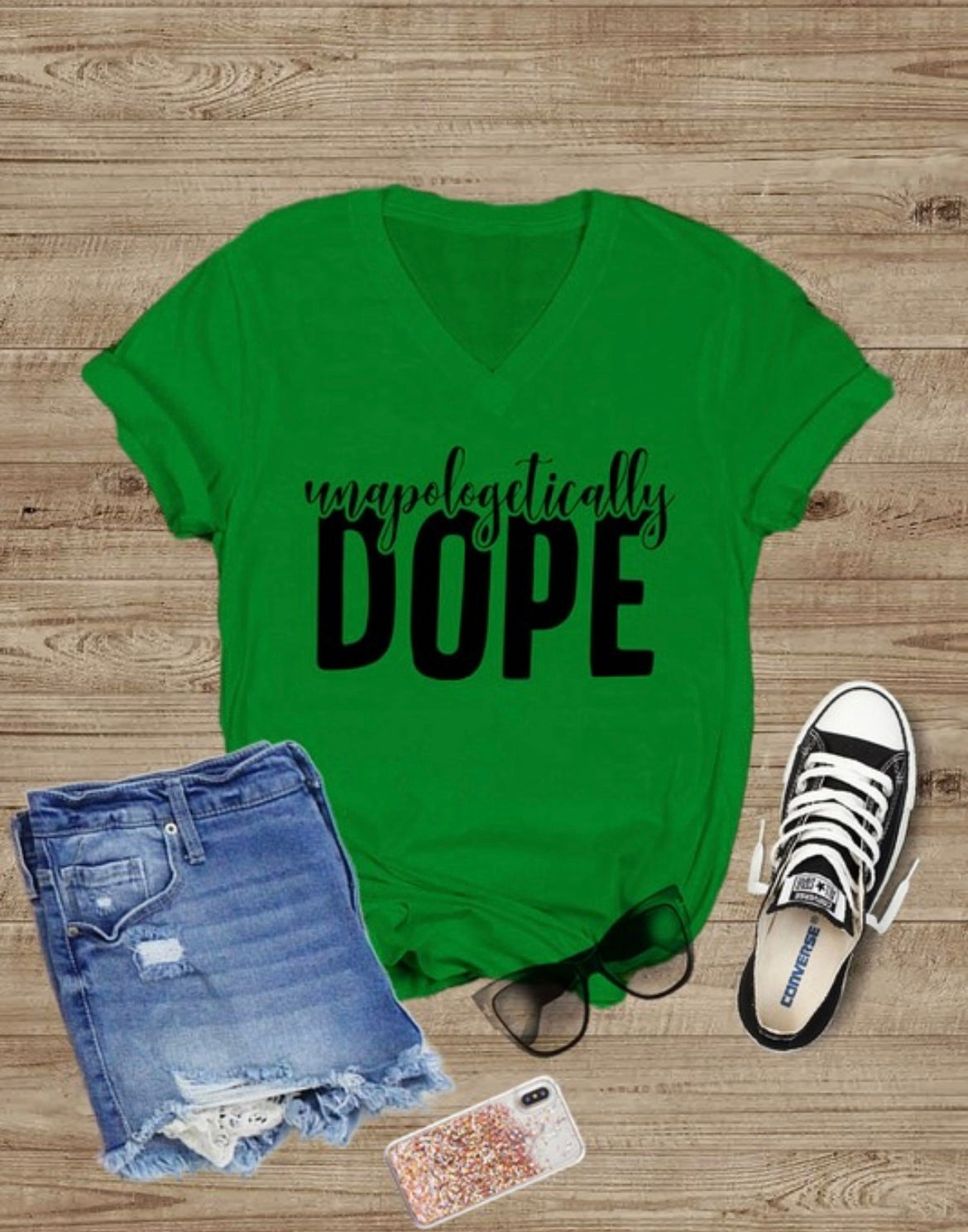 “Unapologetically Dope” v- neck unisex T-shirt. Green with black writing. 100% cotton