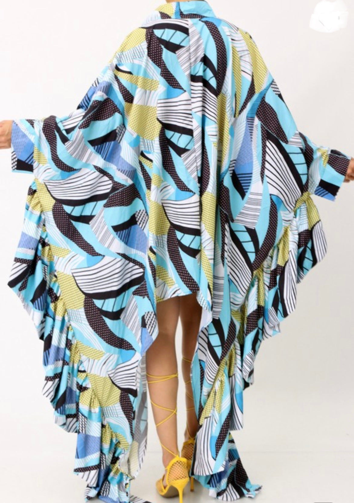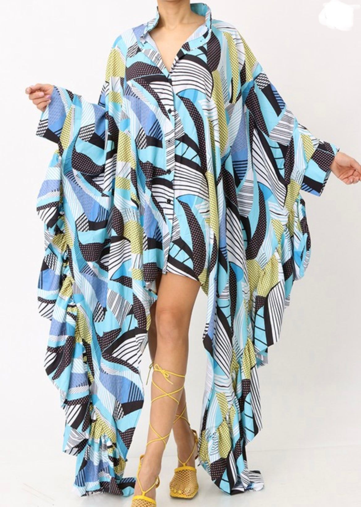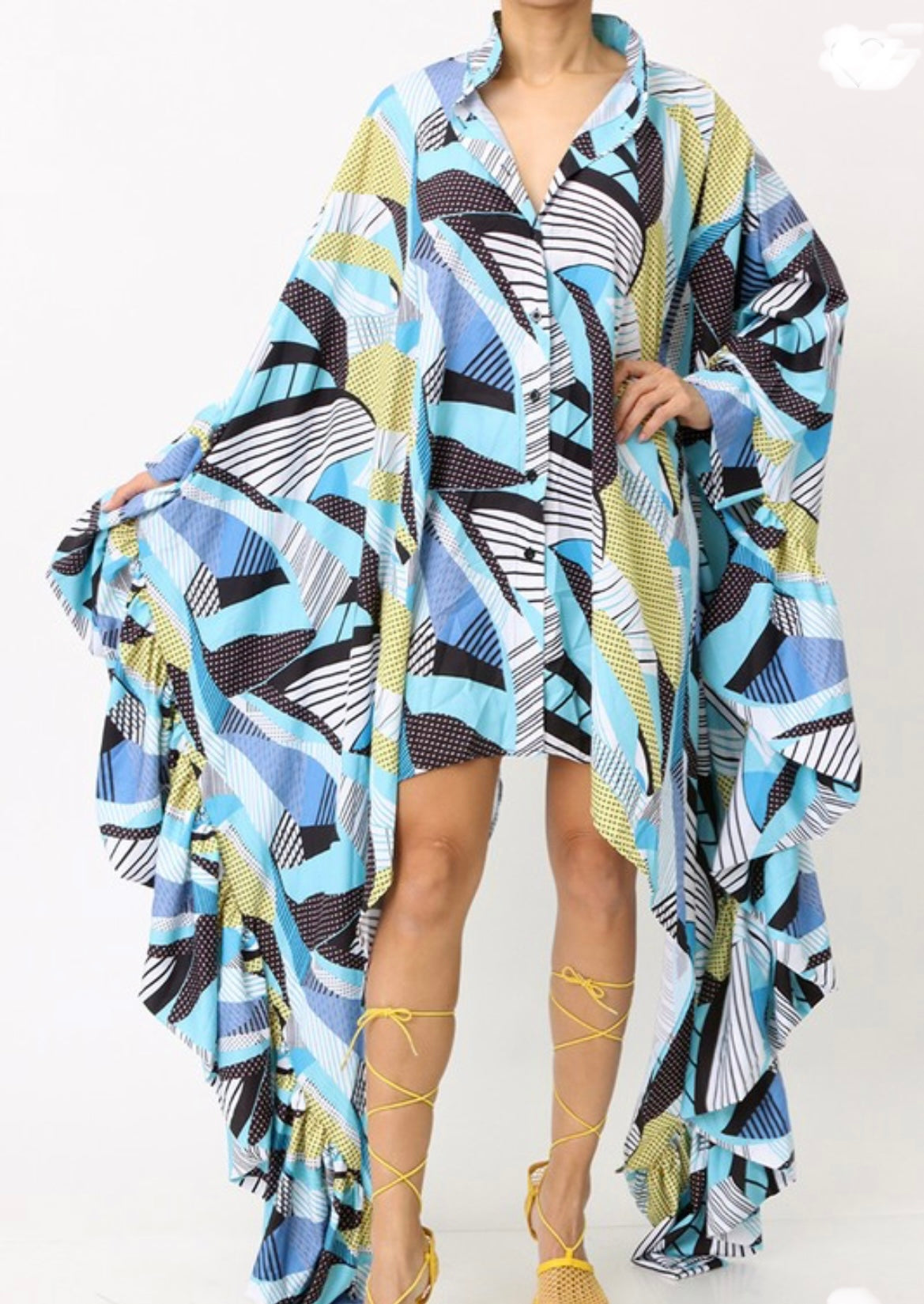 Short sleeve button down mini dress with collar and flowing ruffles on arms. One size fits most.