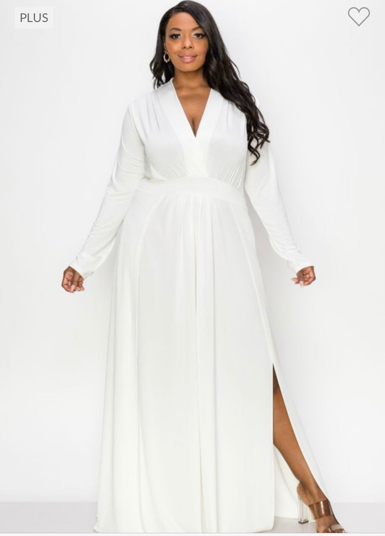 Long sleeve, v-neck maxi with split on both sides. Stretch material. Available colors: white, coral