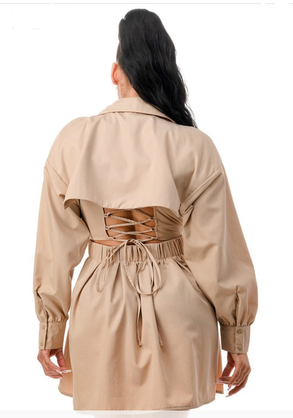 Long sleeve mini dress with elastic waist and adjustable back tie.