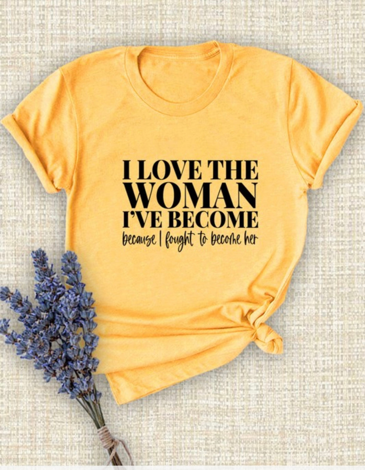 “I Love the Woman I’ve Become…” crew beck T-shirt. 100% cotton. Gold with black writing