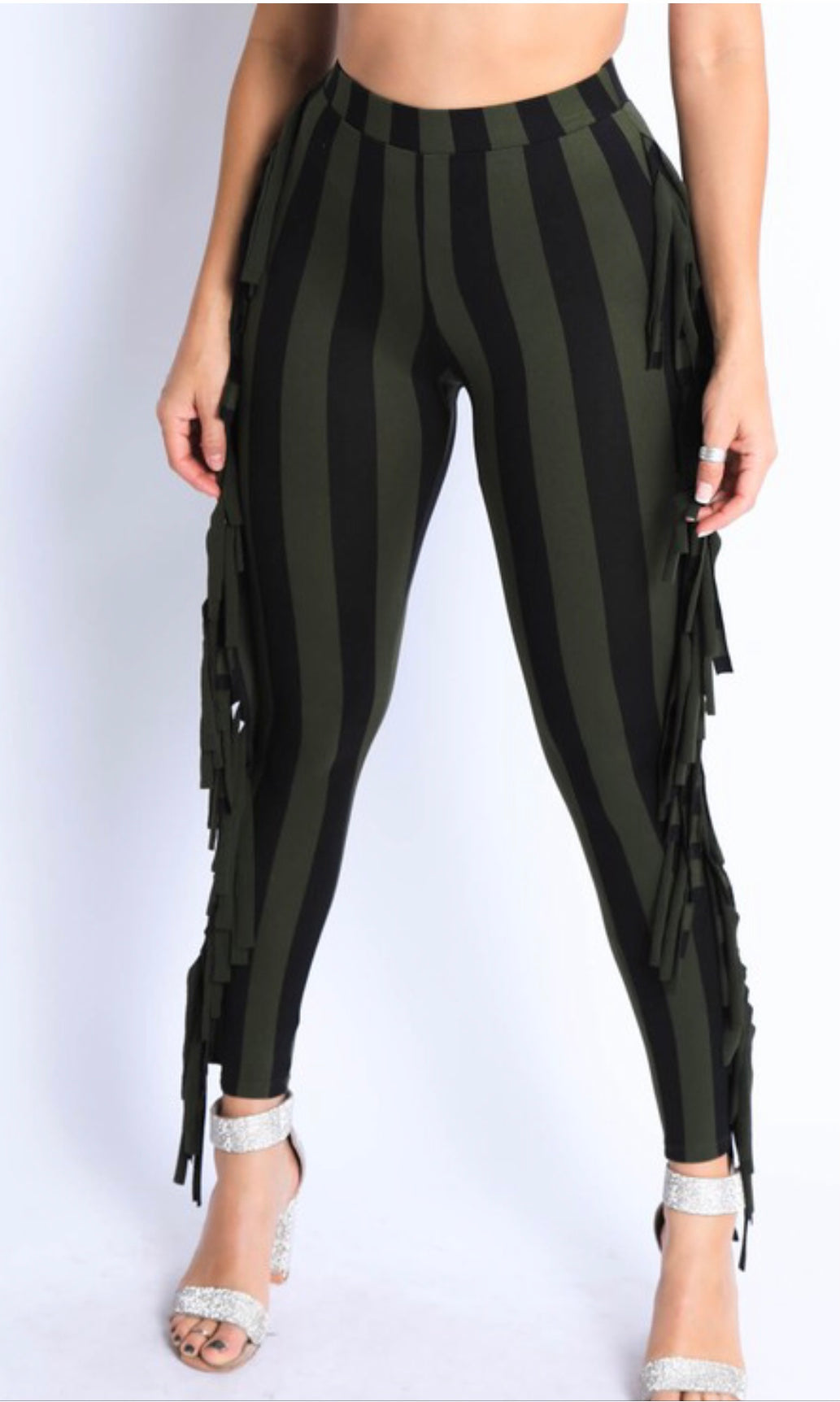 Striped leggings with fringe details on sides.