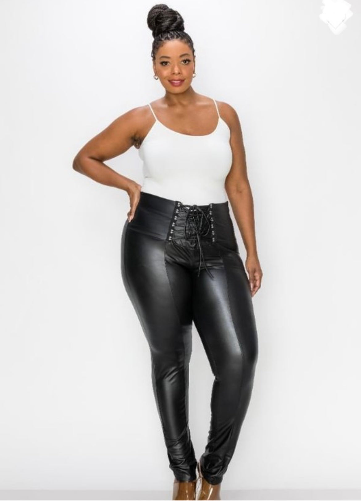 Super PU stretch pants with lace up corset detail, back zipper, and back leg seam.