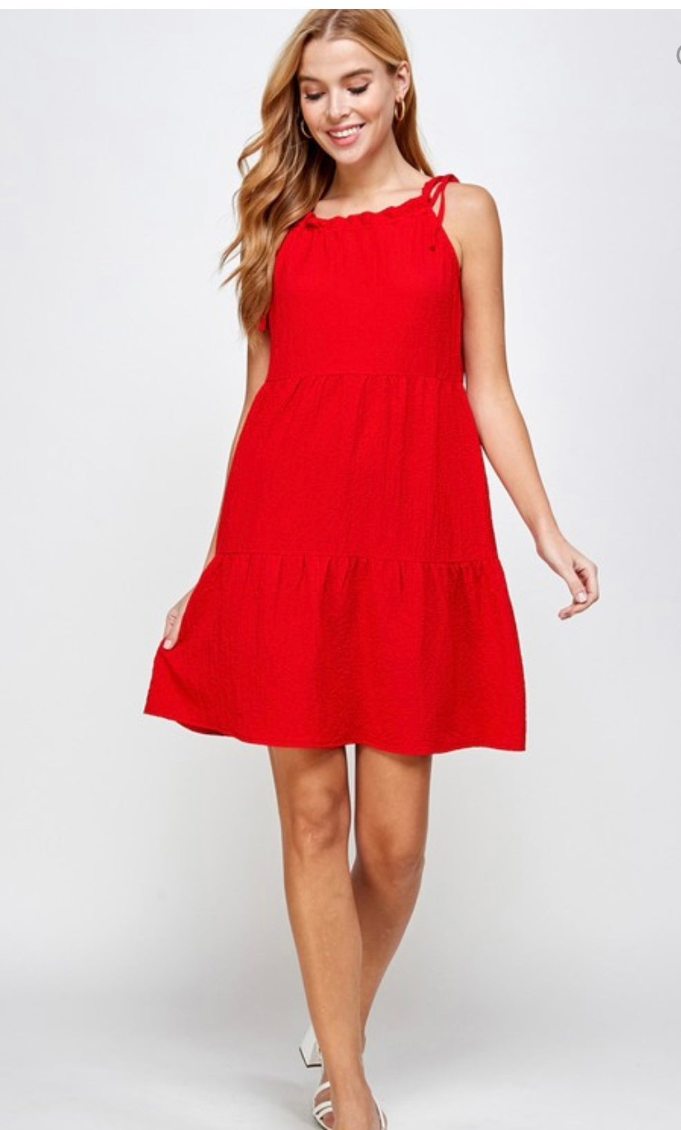 Tie shoulder tiered mini dress. Straps are adjustable. Runs about 1 size larger. Very comfortable.