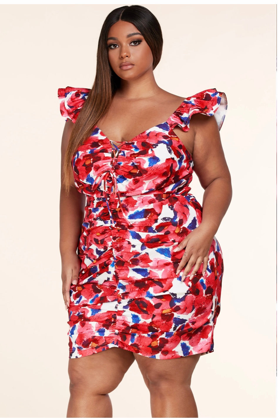 Floral Ruched Bodycon Dress with a lace-up sweetheart neckline, short ruffle sleeves, hidden side zipper, and a ruched, bodycon silhouette that ends in a flirty mini hem.