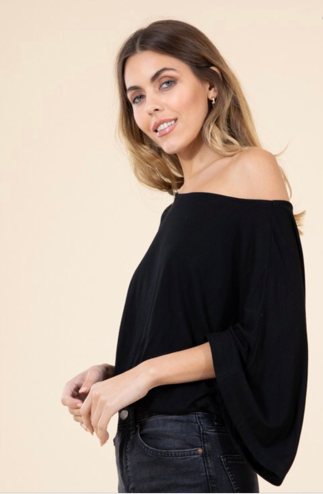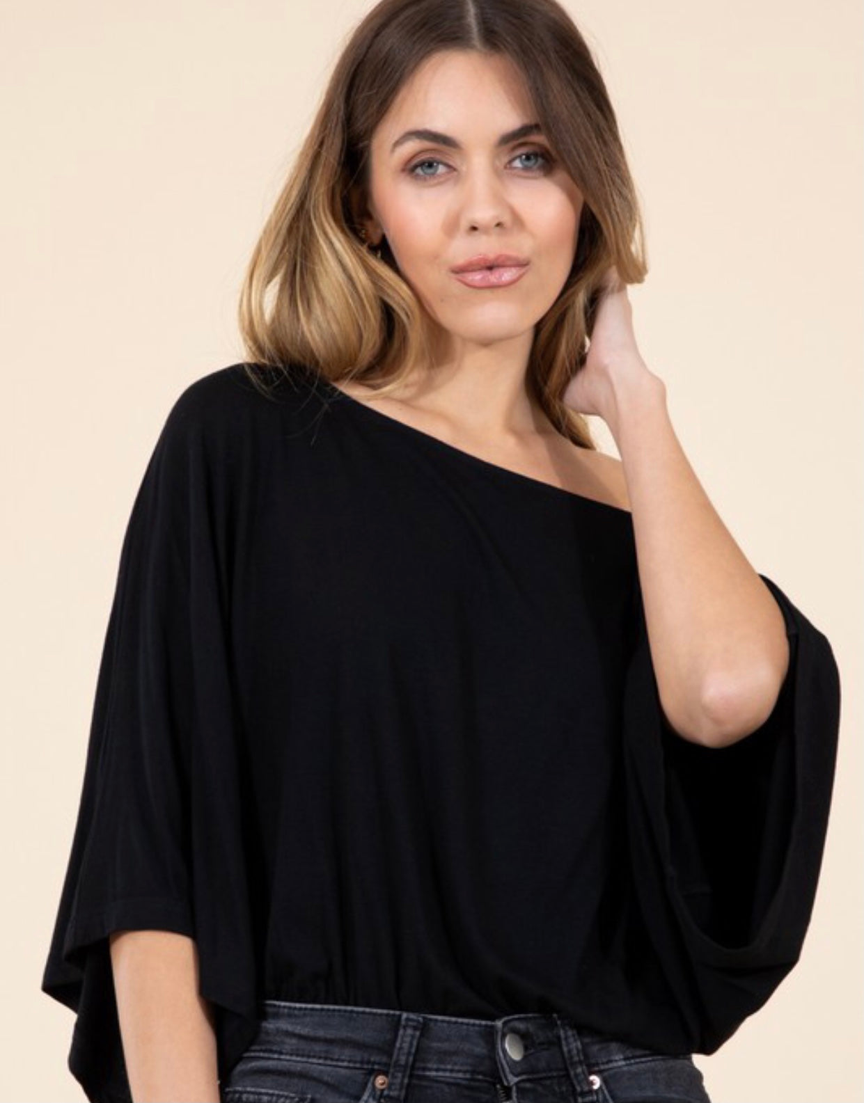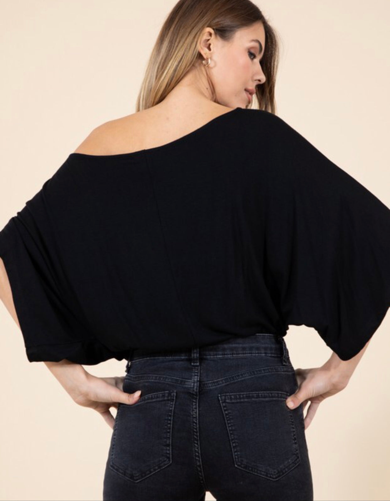 Off shoulder, short sleeve, loose fit bodysuit with snap panty. Black