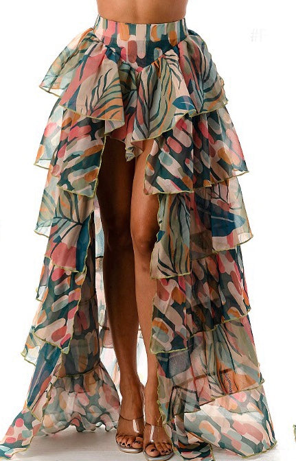 Colorful open front, flared, tiered, maxi skirt with attached panty, side zipper, and side zipper.