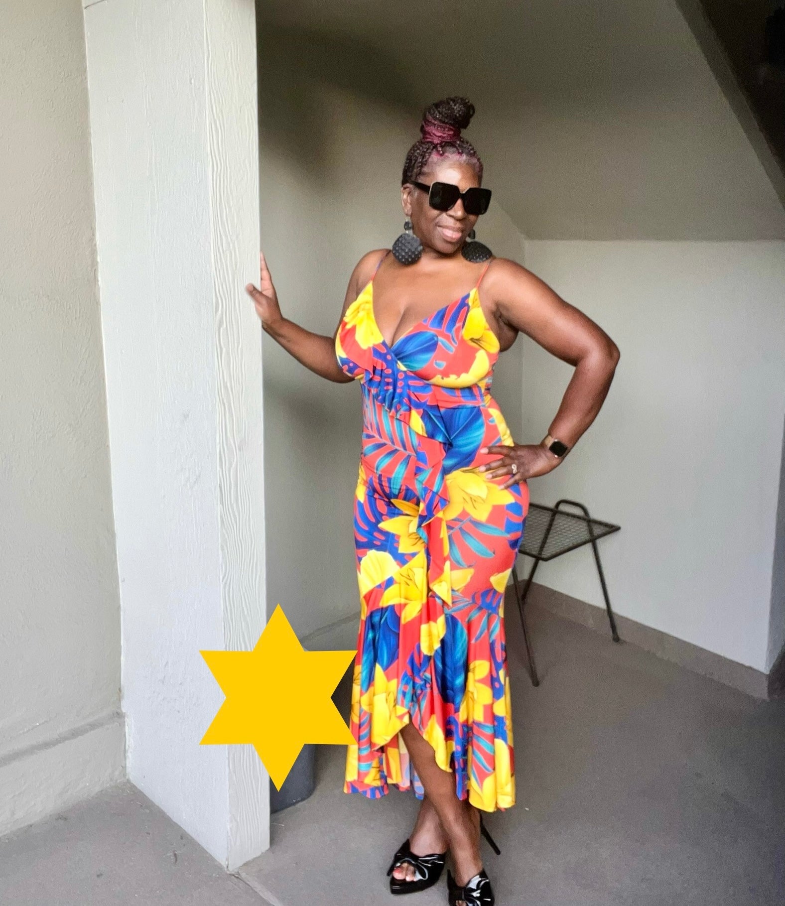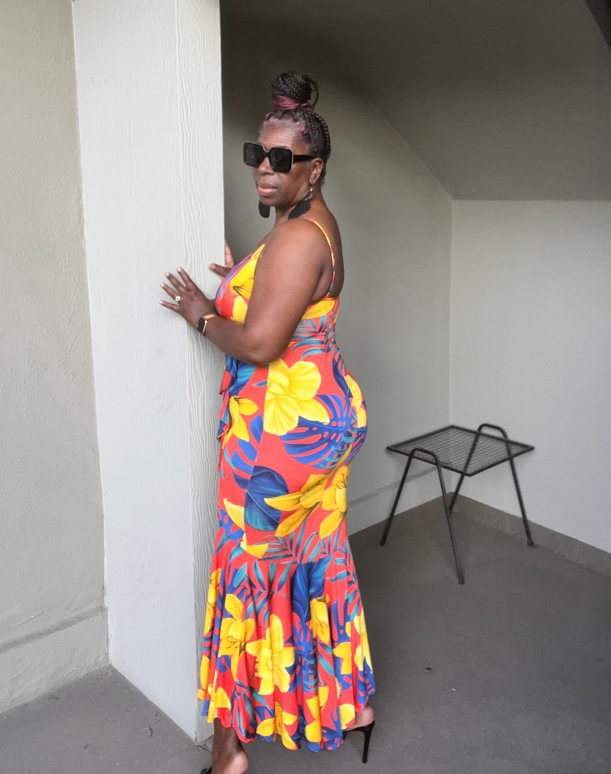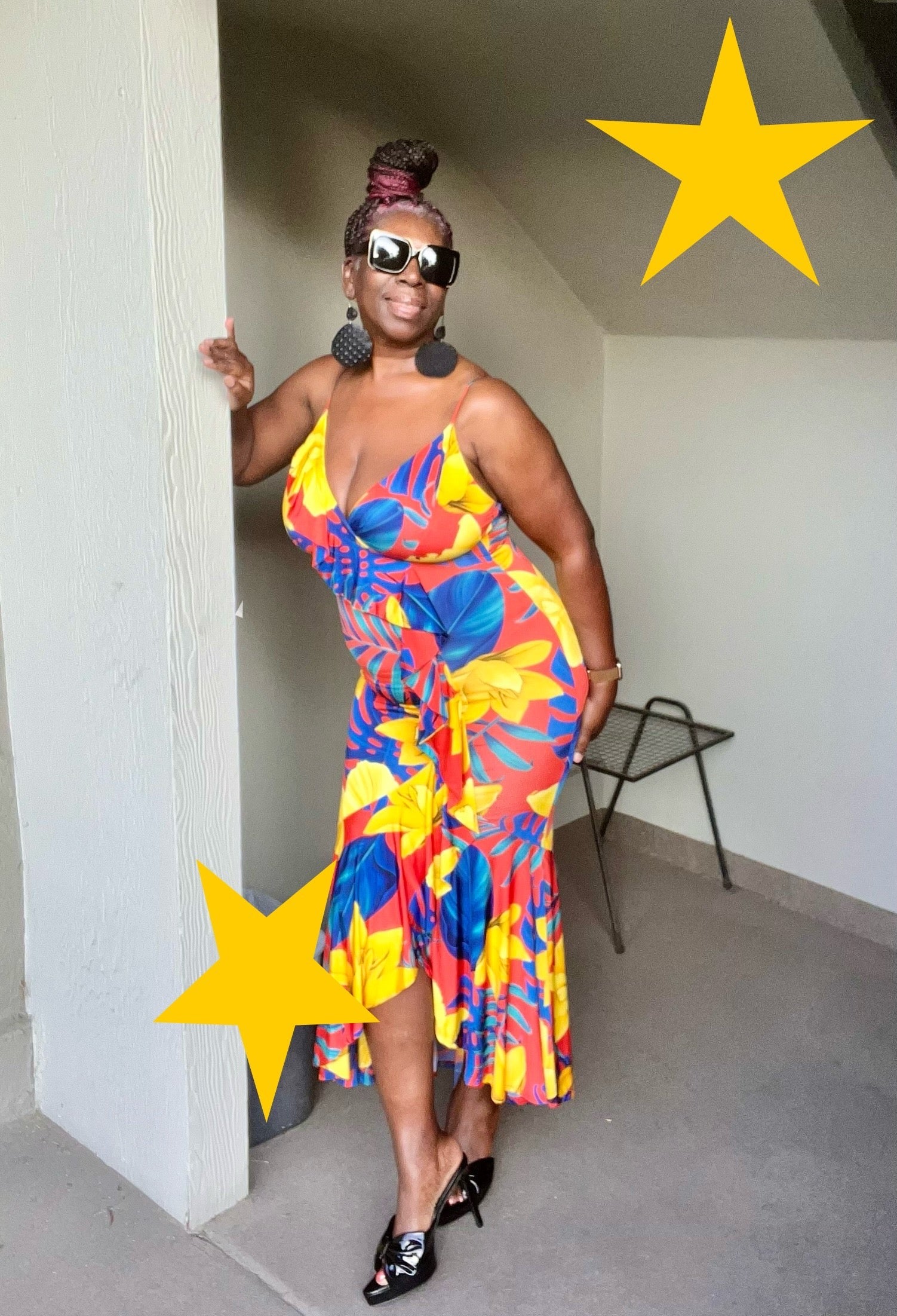 Multi color maxi dress with adjustable straps, front slit and ruffles on tail and front.