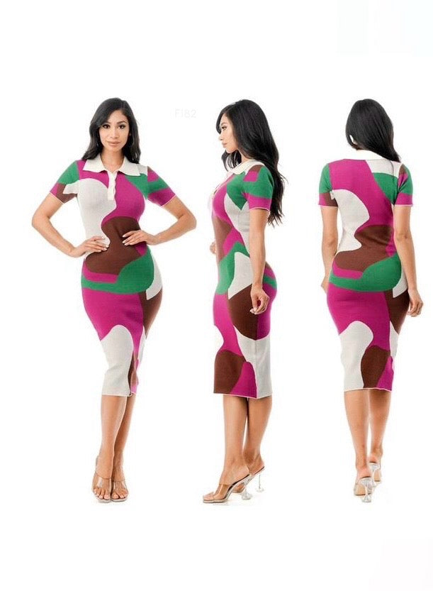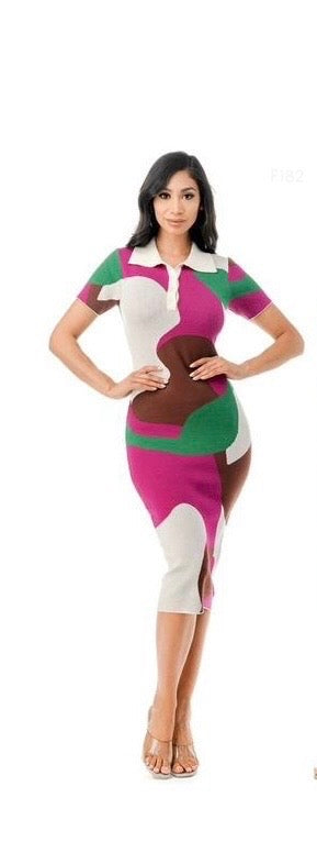 Women’s short sleeve multi color midi sweater dress with collar and top buttons.