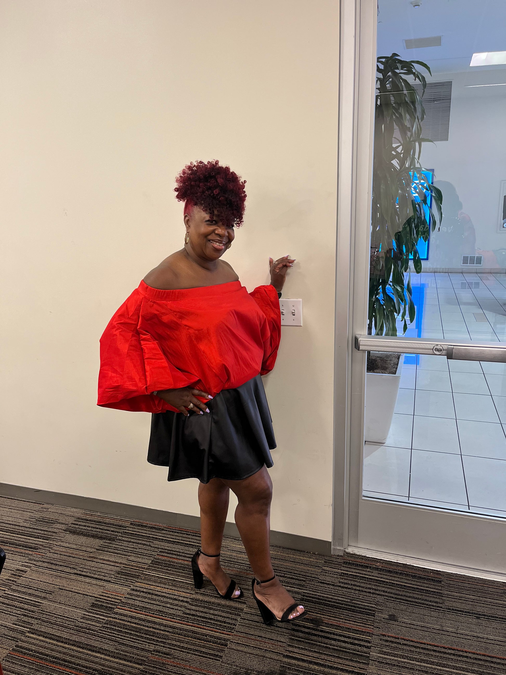 Loose fitting, off shoulder blouse with elastic at waist, shoulders, and wrists. Red