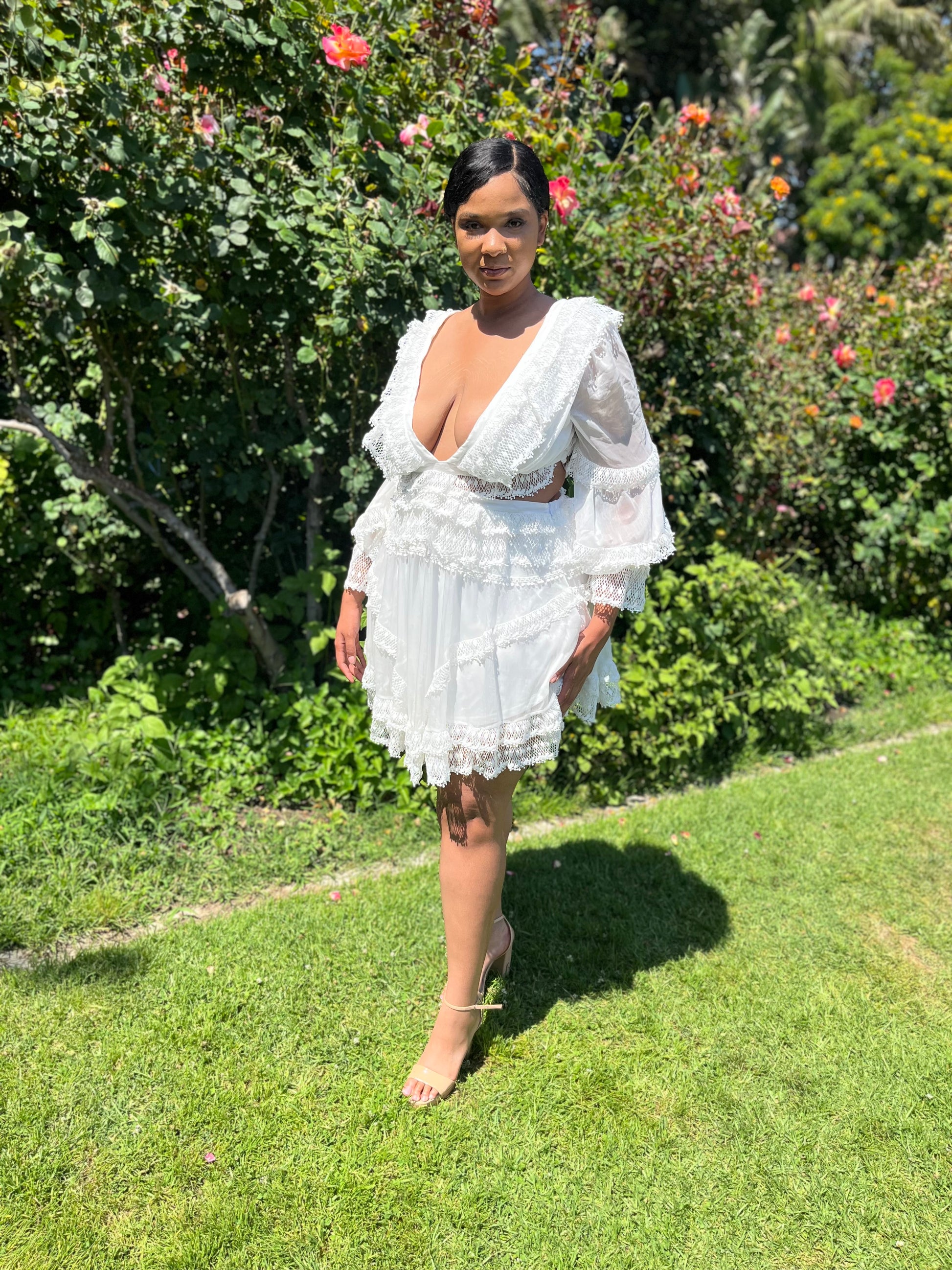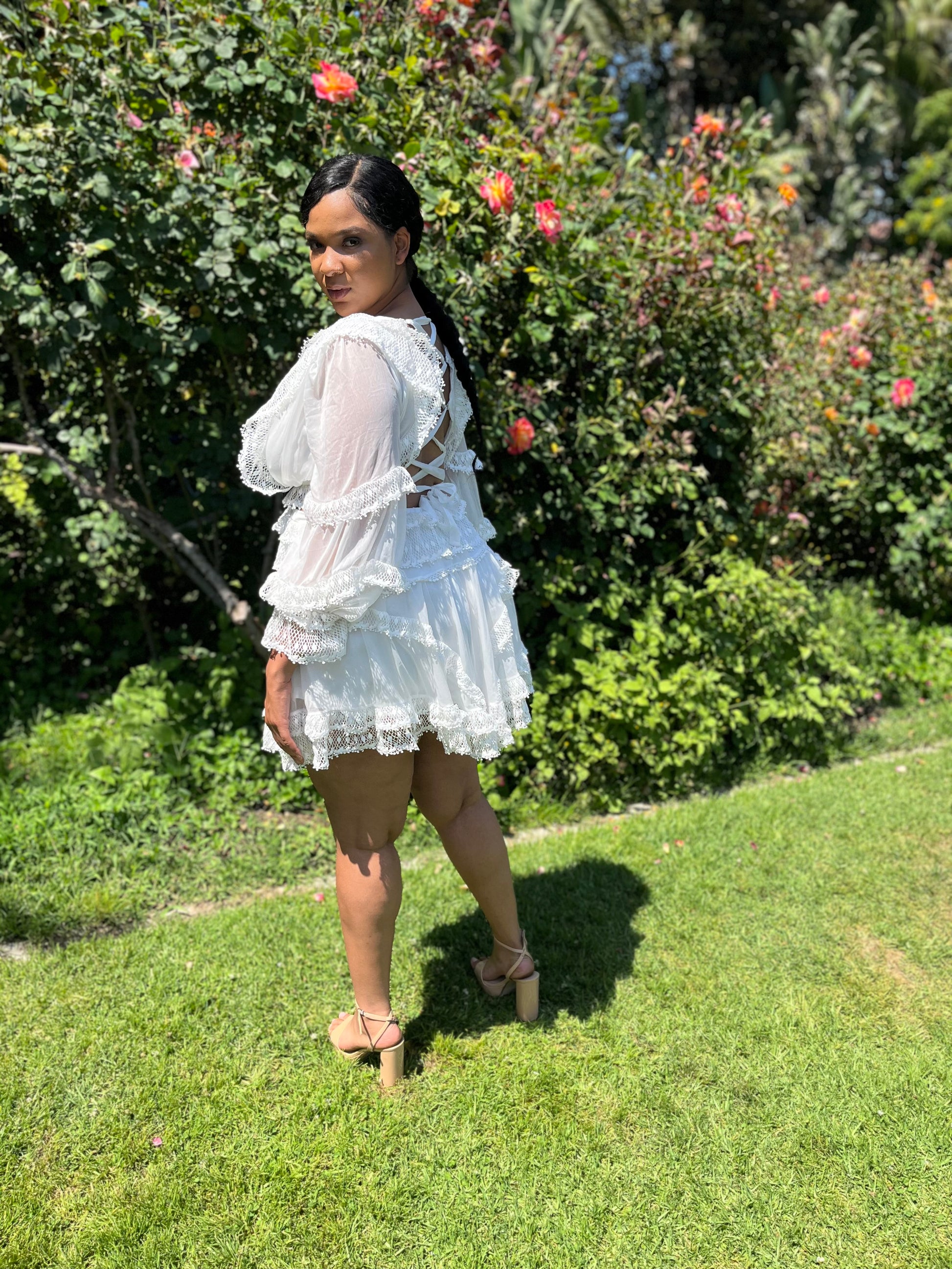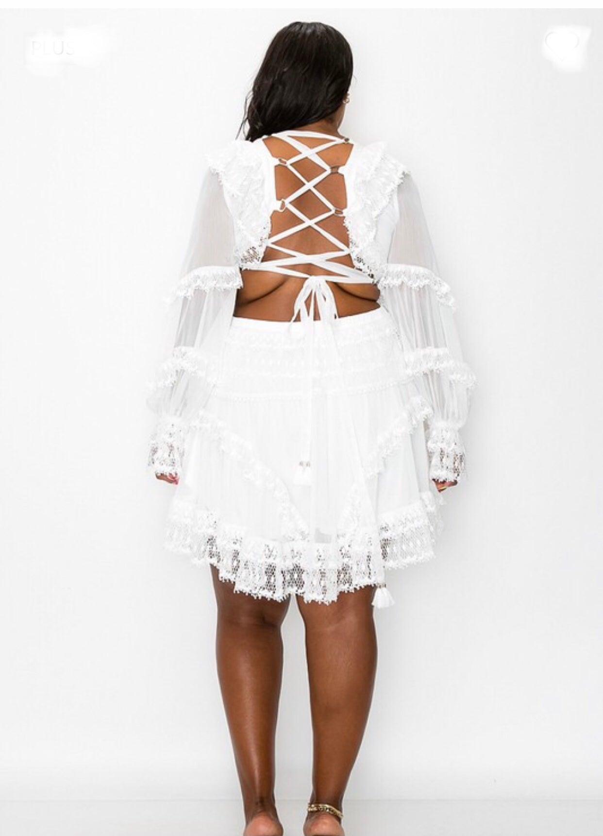 Long sleeve with side cutouts, lace up back, ruffles and mesh sleeves.