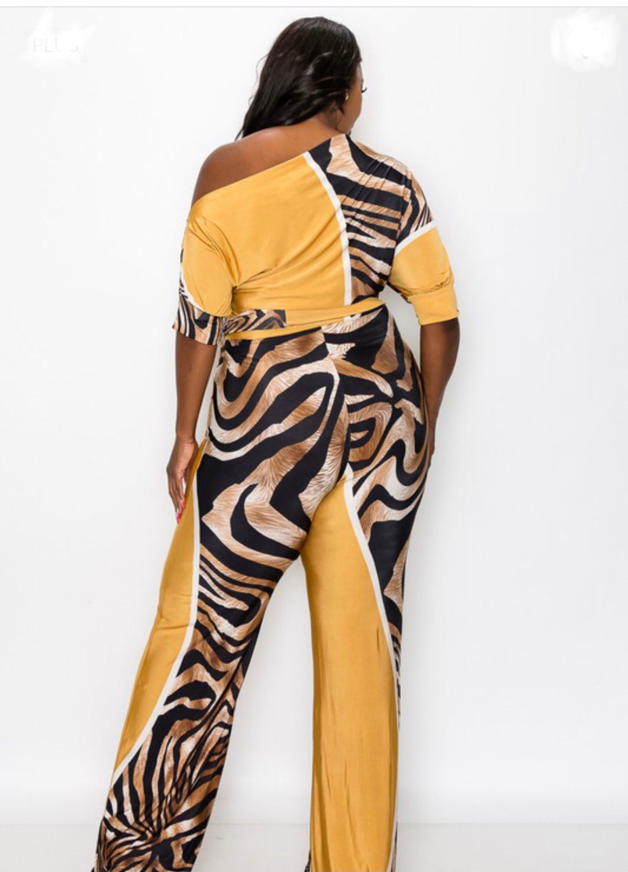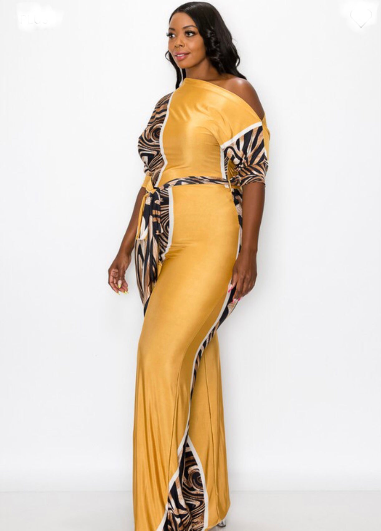 Mustard and animal print wide leg, off shoulder jumpsuit with detachable belt.