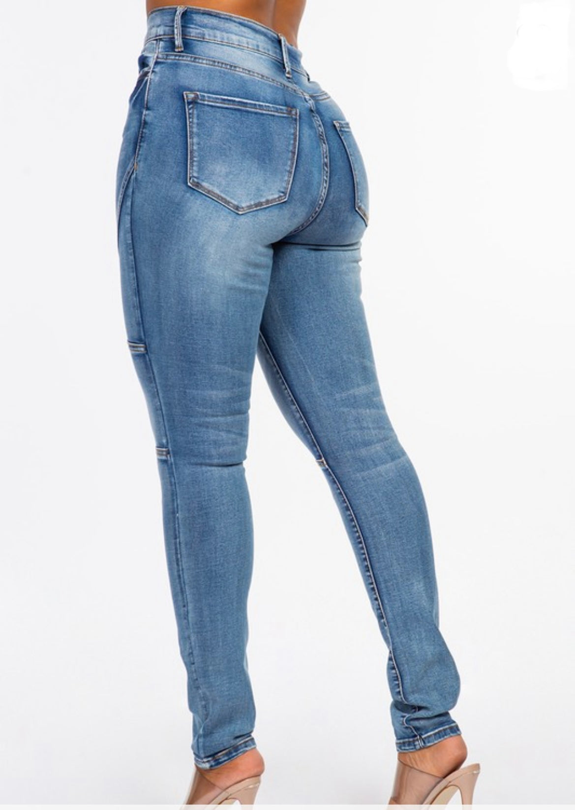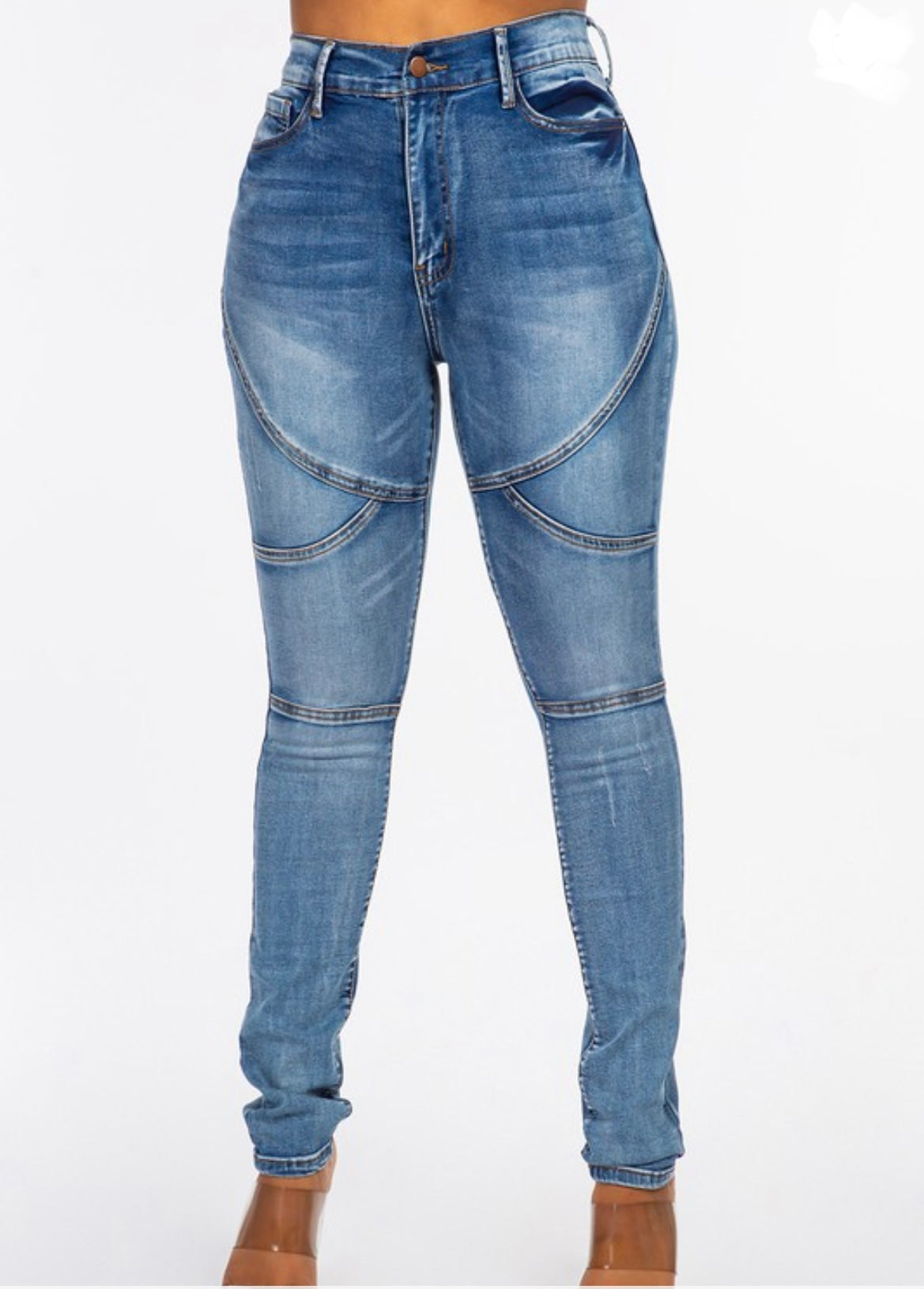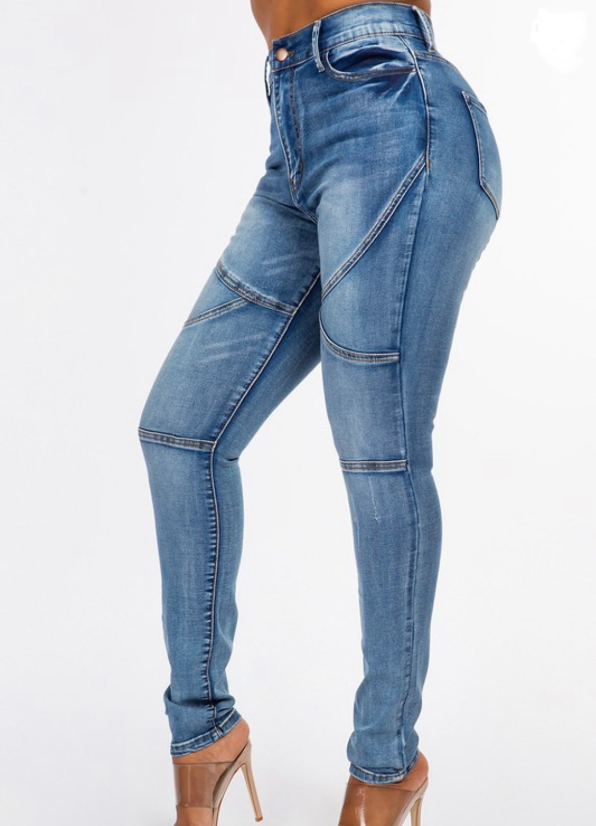 Shape conforming skinny jeans with front and back pockets, stretch, and front stitching detail.